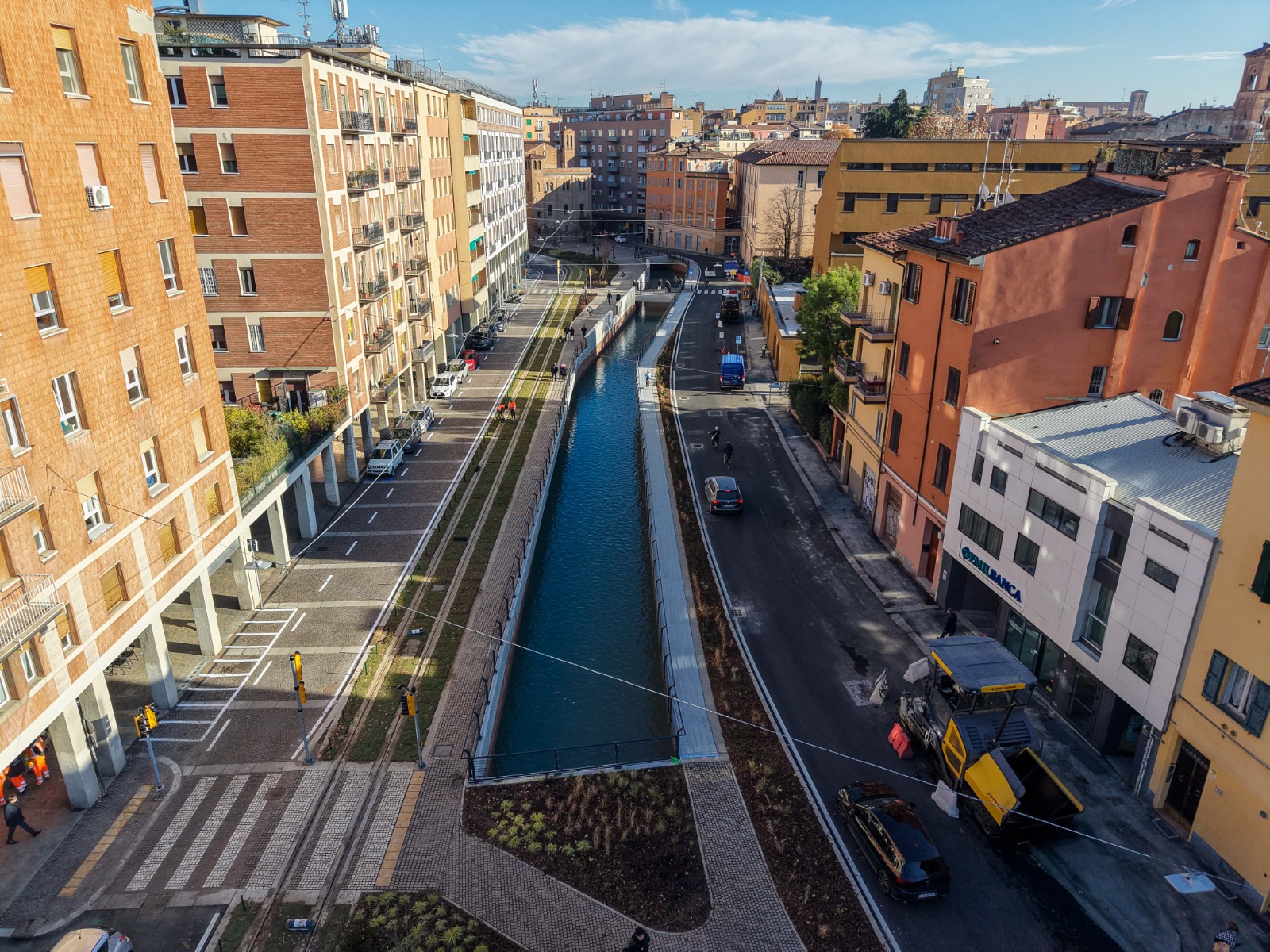 Rimosse le transenne e smantellate le attrezzature di cantiere, il tratto di via Riva di Reno attraversato dal canale scoperto appare nella sua veste definitiva: uno spazio pubblico nuovo e vitale, completamente riqualificato e restituito alla città con una diversa funzione. Non più un parcheggio a cielo aperto, ma un’area urbana dove qualità ambientale, identità storica e mobilità sostenibile si incontrano.