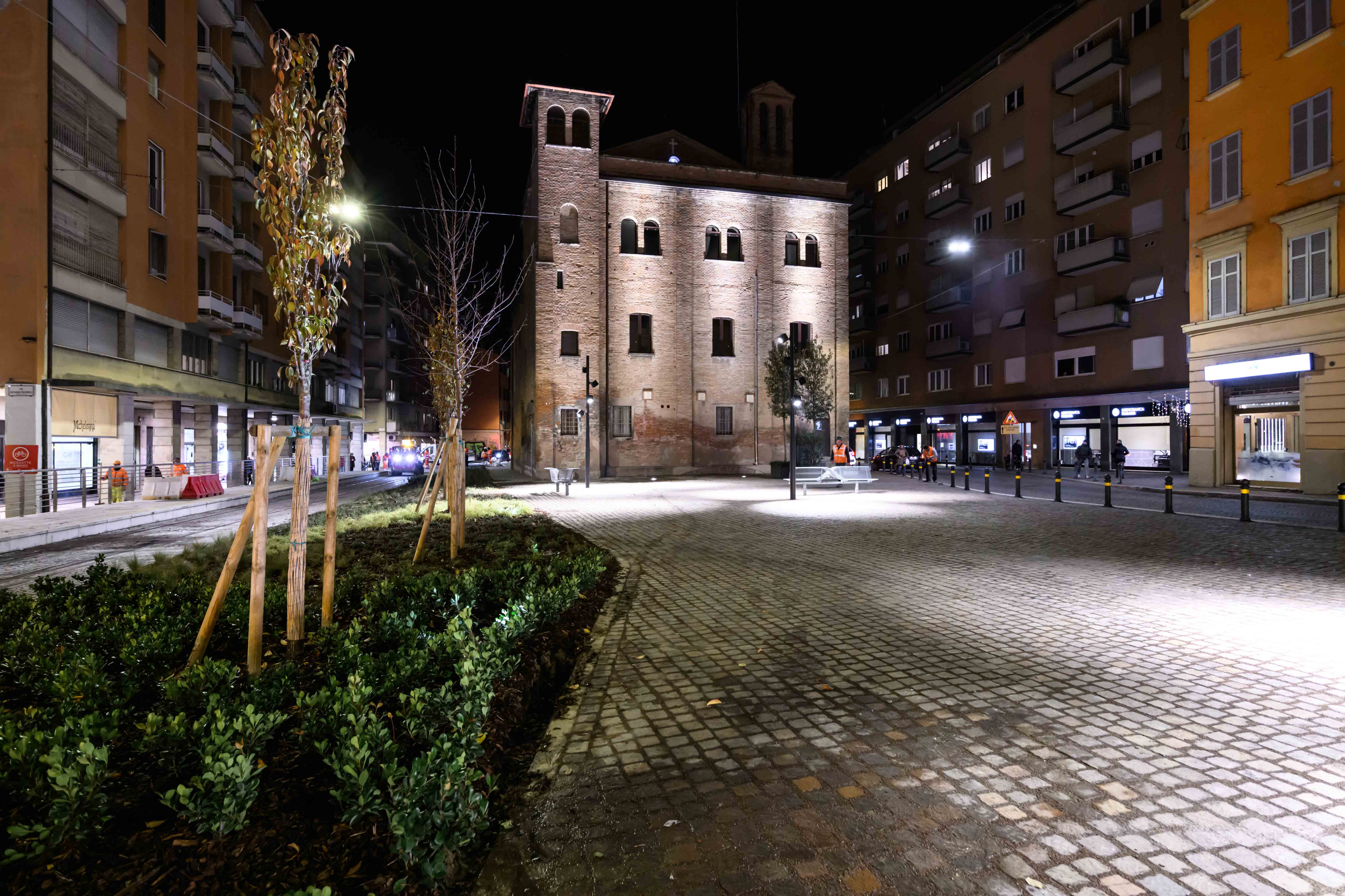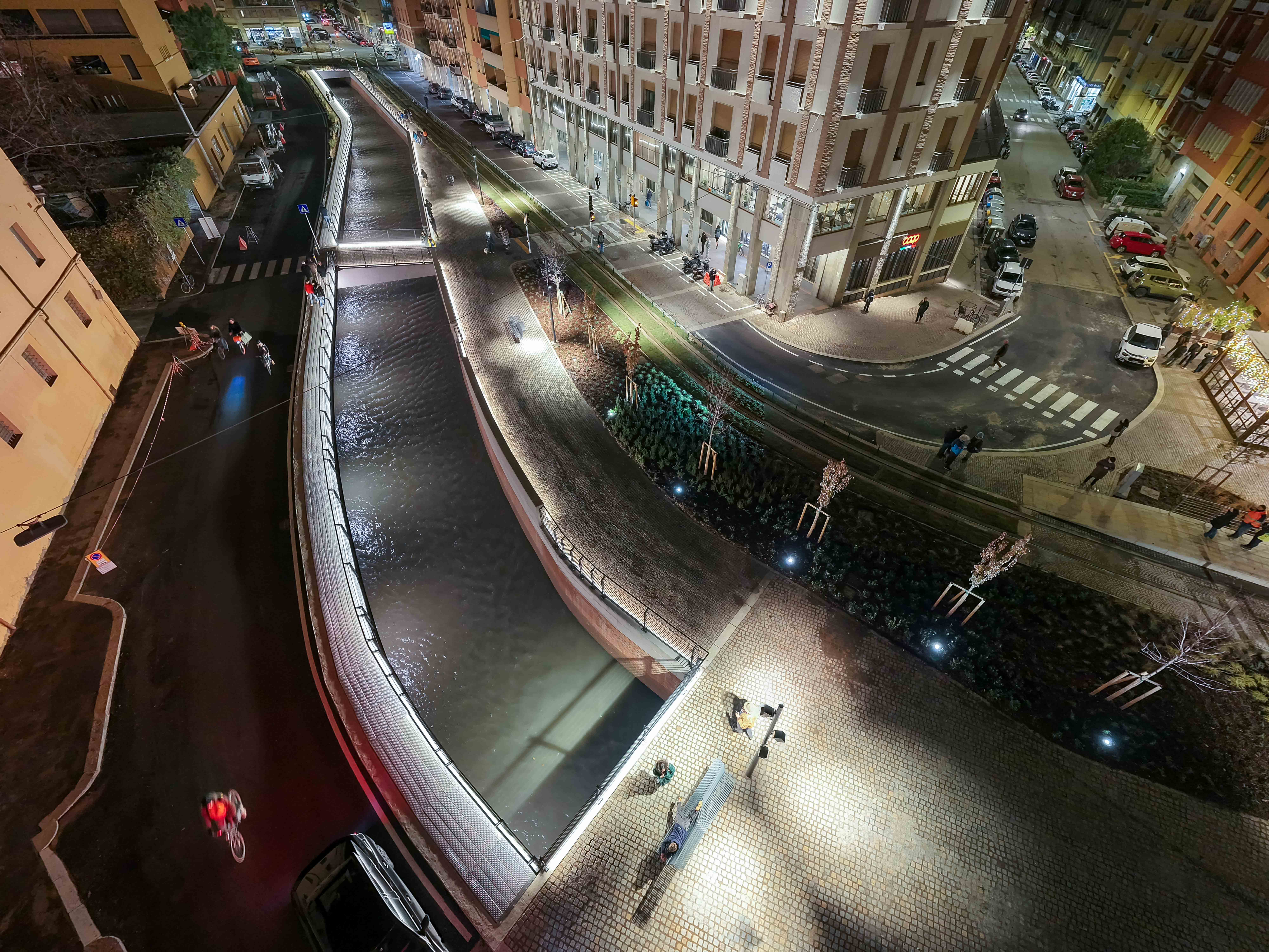 Il cambiamento più significativo si apprezza nella porzione compresa tra la rotonda di piazza Azzarita e la Chiesa di Santa Maria della Visitazione, dove il canale è stato riportato alla luce e ora è costeggiato da percorsi pedonali lungo il lato nord e a sbalzo sulla sponda sud, con una passerella per l’attraversamento. La piazzetta che affaccia sulle acque e trae forza dal retro del Santuario che fa da quinta, è uno dei tratti distintivi della nuova fisionomia di Riva Reno e sarà palcoscenico naturale dell’evento di inaugurazione. L’intera area è costellata da 13 nuove alberature — prunus, frassini, querce e aceri — che, insieme alle aiuole e agli spazi verdi, contribuiscono a migliorare la qualità ambientale. Il risultato è un luogo ampio, aperto e fruibile, pensato per diventare punto di incontro e socialità per residenti e visitatori.